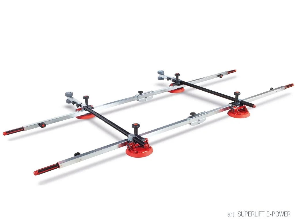 Il SUPERLIFT E-POWER è dotato di quattro ventose elettroniche autoinnescanti che possono essere posizionate in qualsiasi punto del telaio. Il sistema riattiva automaticamente l’aspirazione se rileva una perdita di aderenza, garantendo una presa sicura sulla lastra in qualsiasi momento. Questa tecnologia di aspirazione intelligente consente allo strumento di funzionare autonomamente una volta attivato, permettendo agli installatori di concentrarsi esclusivamente sul posizionamento e sull’installazione.