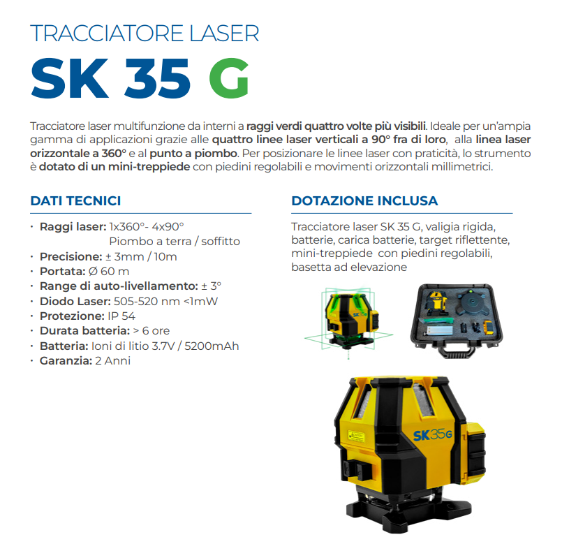 Tracciatore laser raggio verde SK 35 G valigia rigida, kit batterie, carica batterie, target riflettente, mini-treppiede con piedini regolabili