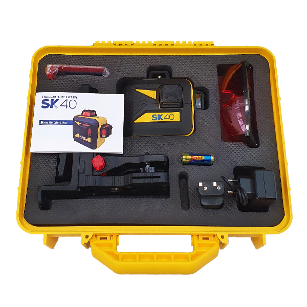 tracciatore laser raggio rosso sk 40, staffa multifunzione a muro e per treppiedi, occhiali per incrementare la visibilità, carica batterie e batterie.