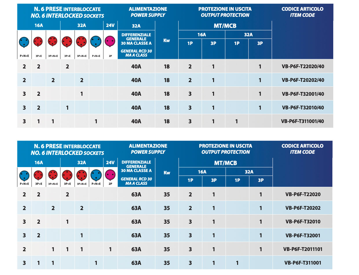 Il Quadro elettrico cassonato da cantiere Β con spina fissa e fungo di emergenza esterni , il quadro VBP6F Γ¨ disponibile in varie composizioni ( controllare la tabella in basso e selezionare il codice prodotto in alto) Β composto da Β 6 prese interbloccate.
