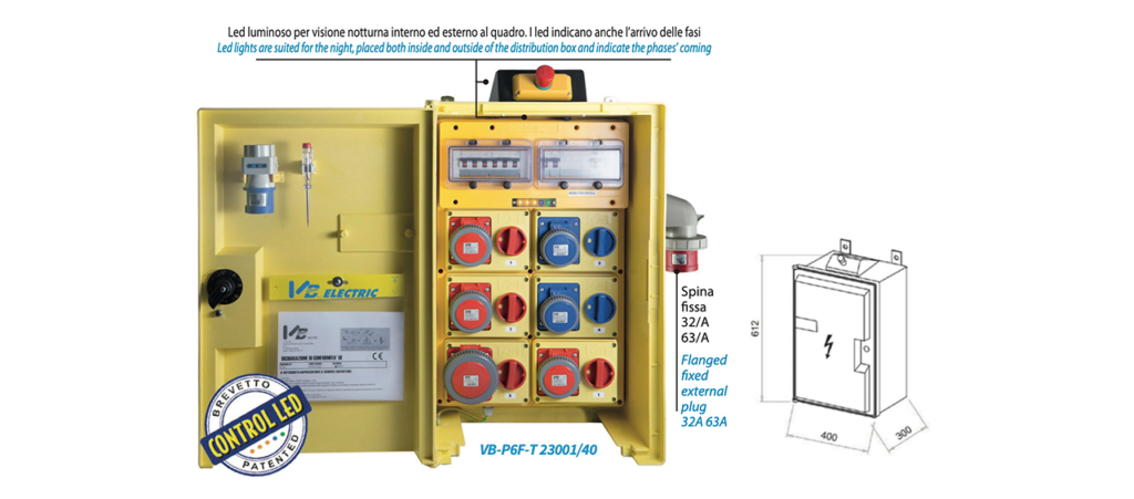 Il Quadro elettrico cassonato da cantiere Β con spina fissa e fungo di emergenza esterni , il quadro VBP6F Γ¨ disponibile in varie composizioni ( controllare la tabella in basso e selezionare il codice prodotto in alto) Β composto da Β 6 prese interbloccate.