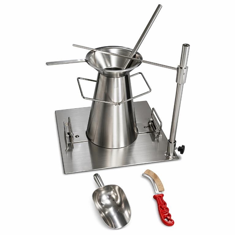 Cono inox, base in acciaio zincato 40×40 con ganci e maniglie , pestello, tramoggia riempimento, sessola, asta graduata, spazzola. Il cono di Abrams è ampiamente utilizzato e segue le linee guida standard definite negli standard ASTM C143 e AASHTO T 119 per il test di slump. È uno strumento importante per il controllo della qualità del calcestruzzo e per garantire che il calcestruzzo soddisfi i requisiti di lavorabilità specifici del progetto EN 12350-2 EN 12350-8 ASTM C143 BS 1881:102 AASHTO T119 NF P18-305.