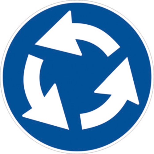 Indica la presenza di una intersezione, un’area, una piazza, ecc. nella quale la circolazione è regolata a rotatoria secondo il senso indicato dalle frecce.