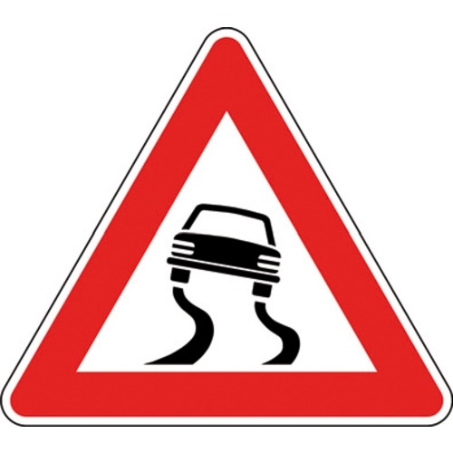 Presegnala un tratto di carreggiata che, in particolari condizioni, può presentare una superficie pericolosamente sdrucciolevole.